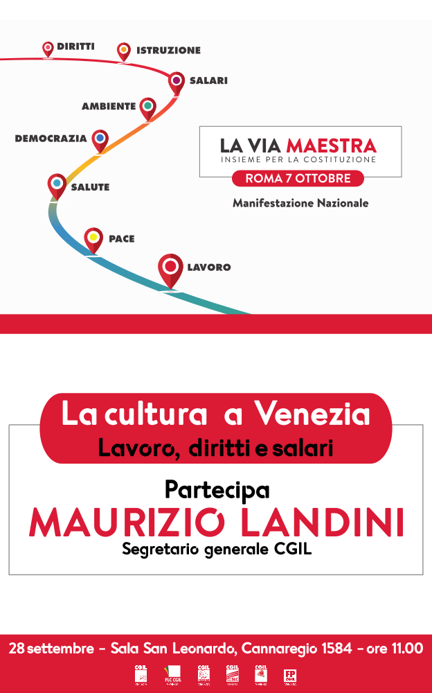 Giovedì 28 settembre alle ore 11.00, nella Sala San Leonardo (Cannaregio 1584), si terrà l’assemblea delle lavoratrici e dei lavoratori veneziani della cultura. Per l’occasione sarà presente anche il Segretario generale CGIL nazionale Maurizio Landini.