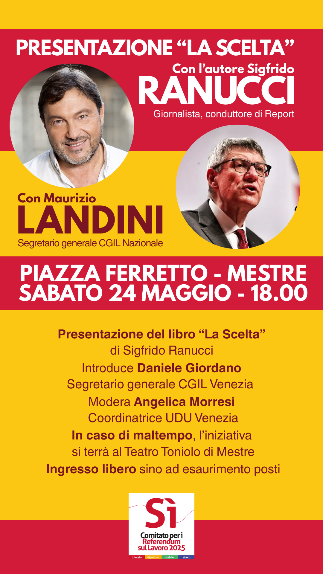 Sabato 24 maggio alle ore 18.00, Piazza Ferretto a Mestre diventerà il centro di un importante appuntamento culturale e civile: la presentazione del libro “La Scelta” di Sigfrido Ranucci, noto giornalista e conduttore del programma Report. Assieme all’autore, interverrà Maurizio Landini, segretario generale della CGIL Nazionale.