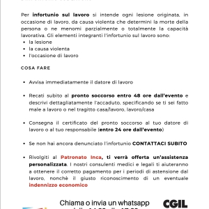 Di fronte a questo scenario, la CGIL Venezia ha deciso di dedicare agli infortuni una linea telefonica e whatsapp gratuita (dalle 14.30 alle 17.30, dal lunedì al giovedi), al numero 3427757193, attraverso la quale le operatrici e gli operatori del Patronato Inca possano assistere, guidare o anche soltanto sciogliere dubbi sulle procedure necessarie a denunciare correttamente un infortunio. Spesso, nei nostri uffici, assistiamo persone che, a causa di procedure non attuate correttamente, subiscono conseguenze difficilmente rimediabili sul piano professionale e sulla salute.